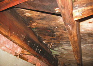 Surface mold will create cosmetic discoloration only and can be cleaned off. Decay fungi (above) will darken and shrink the wood while causing structural damage.